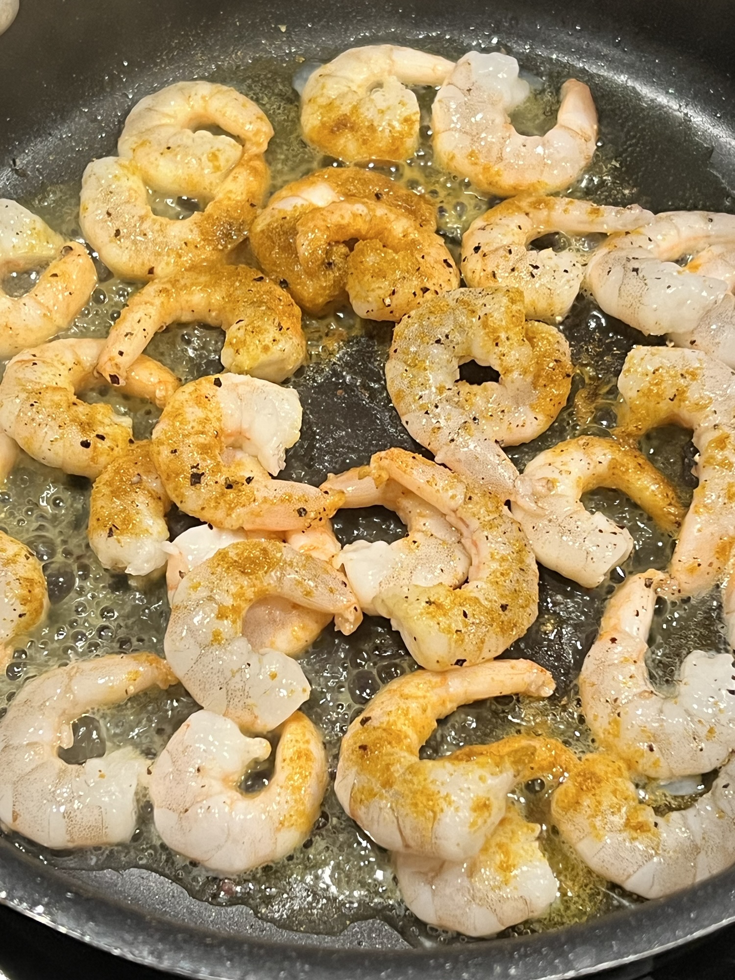 - While the water boils, heat a large skillet or wok over medium-high. Add oil/butter, season shrimp lightly, and sauté 1–2 minutes per side until just pink. Scoop them out.
