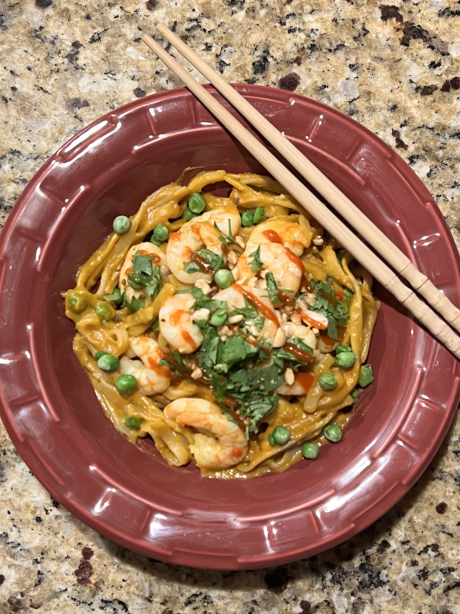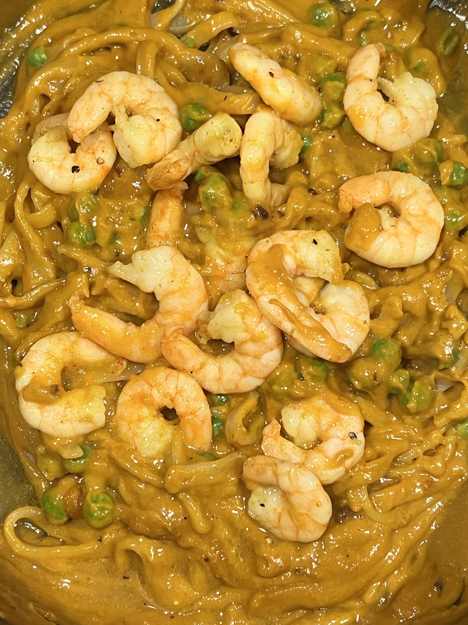 Pap Steve’s Curried Pumpkin Goat Cheese Peanut Shrimp Noodles