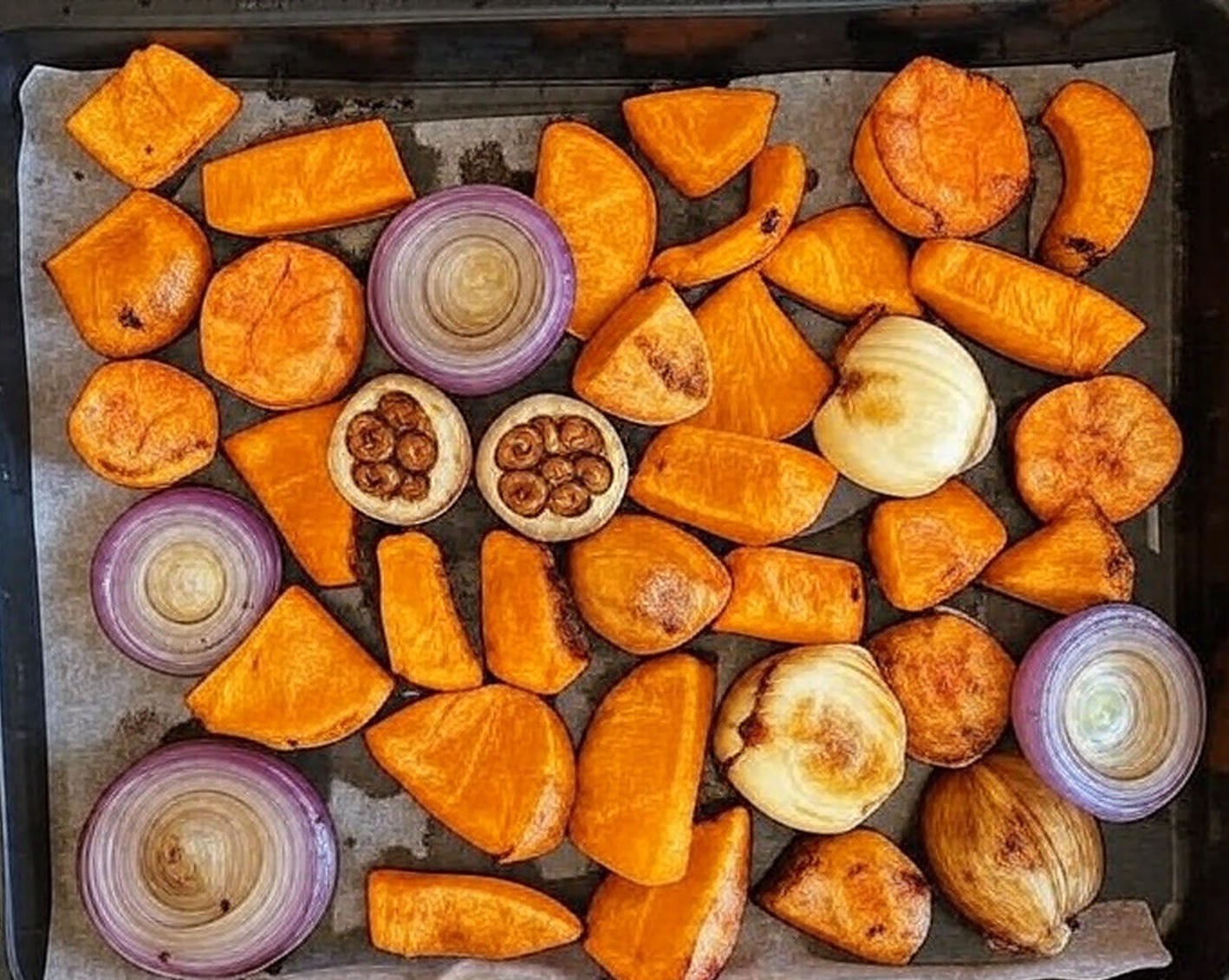 - Fire the oven to 425°F. Throw pumpkin chunks, onion wedges, and garlic cloves on a big sheet pan. Douse with olive oil, hit it hard with salt and pepper, and roast 35–45 minutes, flipping once. You want dark, caramelized edges—that’s where the magic lives.