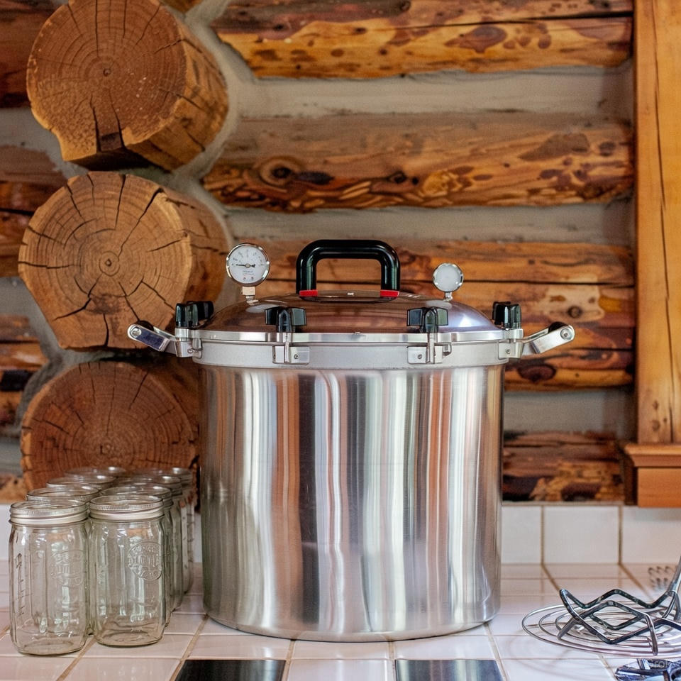 These canners are built in America by Wisconsin Aluminum Foundry and feature a unique metal-to-metal seal, eliminating the need for rubber gaskets that can degrade or fail over time. Constructed from thick cast aluminum with precise machining and secure wingnut locks, they maintain steady pressure via the weighted gauge system—no annual dial calibration required. They work on gas, electric, glass-top stoves (or induction with an adapter), and can double as large pressure cookers for everyday meals.