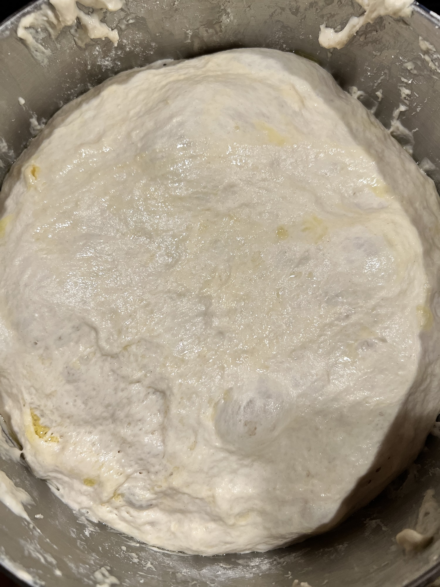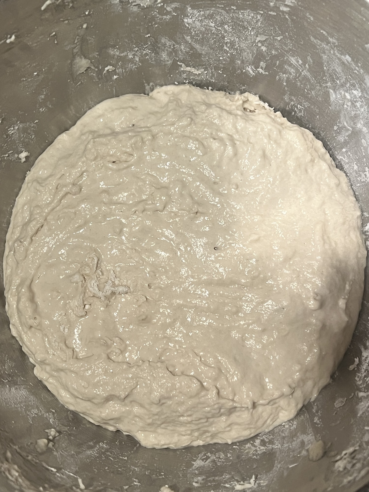 4. Uncover, run mixer on speed 2 for 20–30 seconds to do the stretch-and-fold for you. Cover again, 60-minute nap.